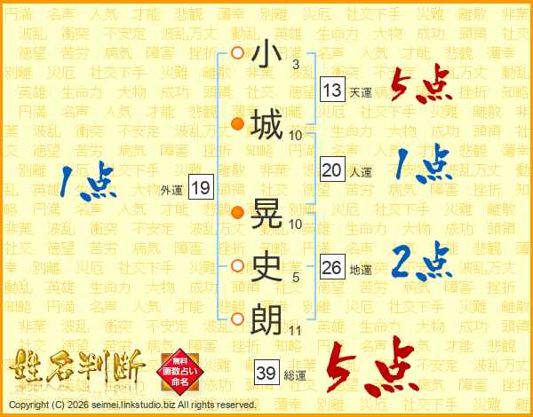 小(3画)城(10画) 晃(10画)史(5画)朗(11画)