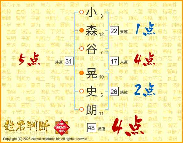 小(3画)森(12画)谷(7画) 晃(10画)史(5画)朗(11画)