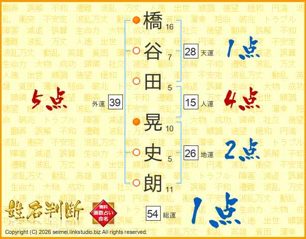 橋(16画)谷(7画)田(5画) 晃(10画)史(5画)朗(11画)