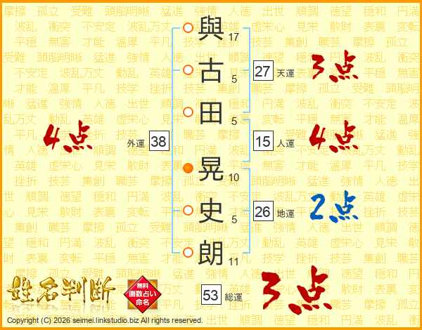與(17画)古(5画)田(5画) 晃(10画)史(5画)朗(11画)