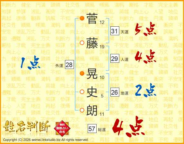 菅(12画)藤(19画) 晃(10画)史(5画)朗(11画)