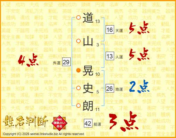 道(13画)山(3画) 晃(10画)史(5画)朗(11画)