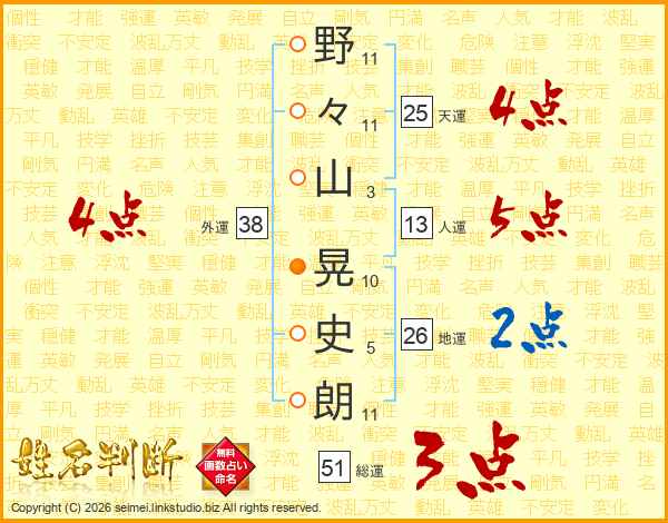 野(11画)々(11画)山(3画) 晃(10画)史(5画)朗(11画)