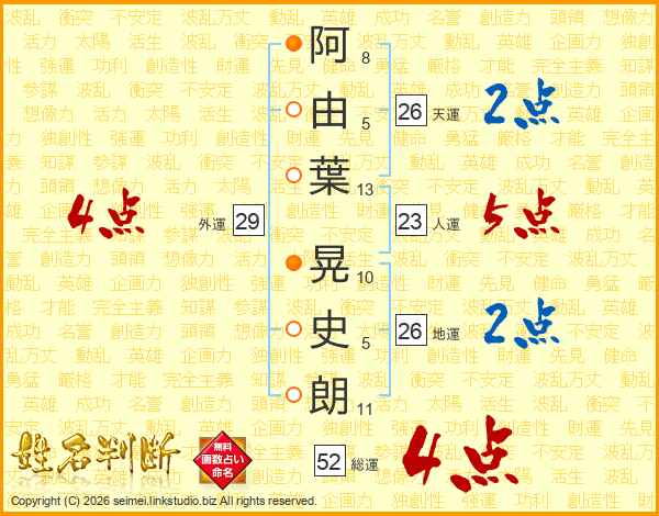 阿由葉晃史朗さんの総運は52画の4点!