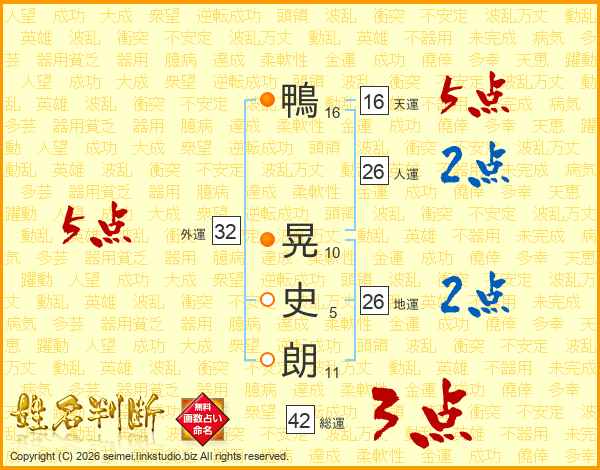 鴨(16画) 晃(10画)史(5画)朗(11画)