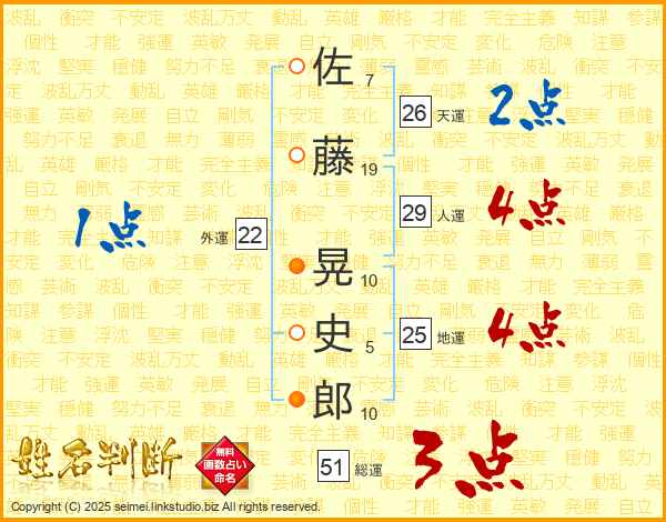 佐藤晃史郎さんの総運は51画の3点!