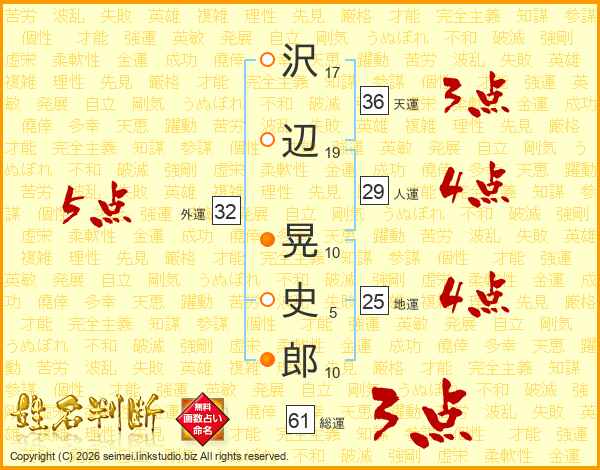 沢(17画)辺(19画) 晃(10画)史(5画)郎(10画)
