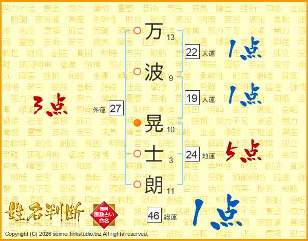 万(13画)波(9画) 晃(10画)士(3画)朗(11画)