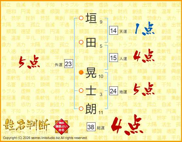 垣(9画)田(5画) 晃(10画)士(3画)朗(11画)