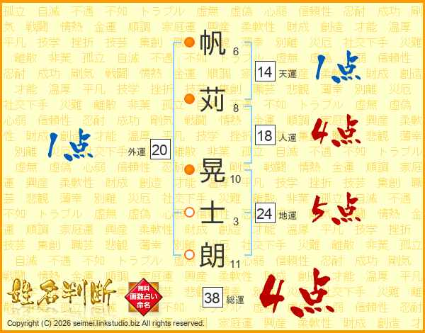 帆苅晃士朗さんの総運は38画の4点!