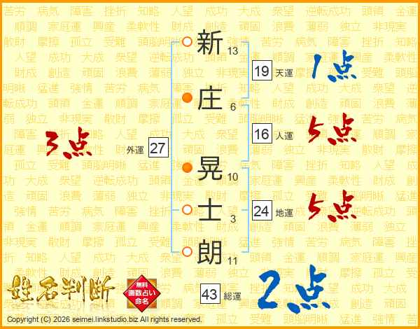 新(13画)庄(6画) 晃(10画)士(3画)朗(11画)