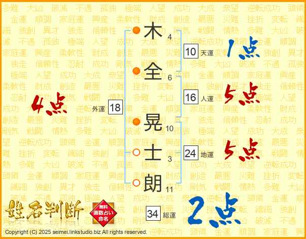 木(4画)全(6画) 晃(10画)士(3画)朗(11画)