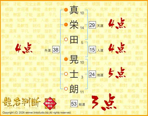 真(10画)栄(14画)田(5画) 晃(10画)士(3画)朗(11画)