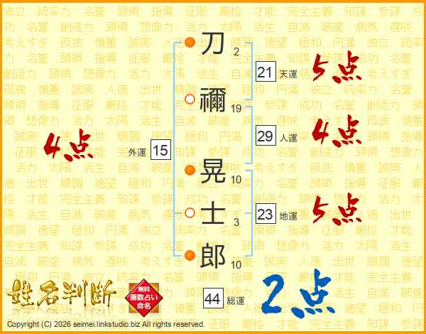 刀禰晃士郎さんの総運は44画の2点!