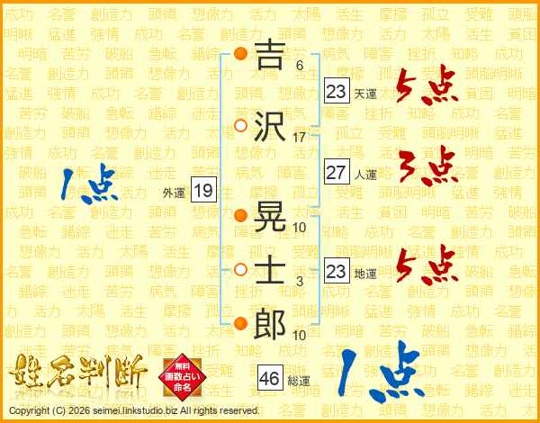 吉(6画)沢(17画) 晃(10画)士(3画)郎(10画)