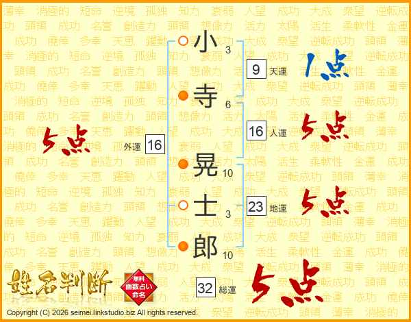 小(3画)寺(6画) 晃(10画)士(3画)郎(10画)