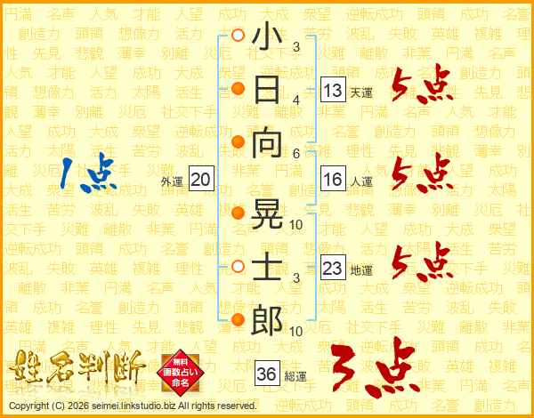 小日向晃士郎さんの人運は16画の5点!