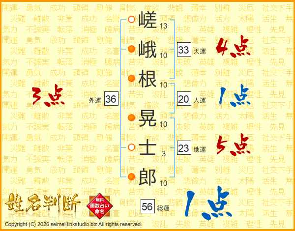 嵯(13画)峨(10画)根(10画) 晃(10画)士(3画)郎(10画)