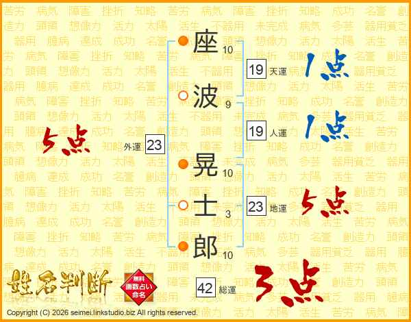 座(10画)波(9画) 晃(10画)士(3画)郎(10画)