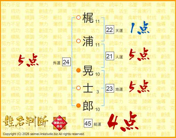 梶(11画)浦(11画) 晃(10画)士(3画)郎(10画)
