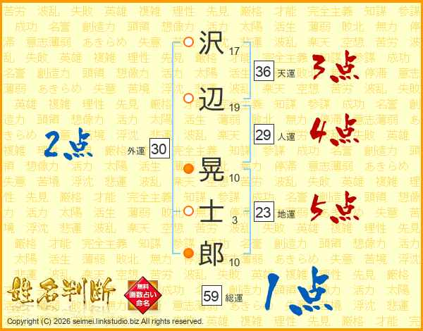 沢(17画)辺(19画) 晃(10画)士(3画)郎(10画)