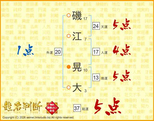 生活面を象徴する運勢です。外部から受ける影響力を表し、結婚運、家庭運や職場、環境への順応性を表します。総運から人運を引いた画数。姓や名が1文字の場合を除く。