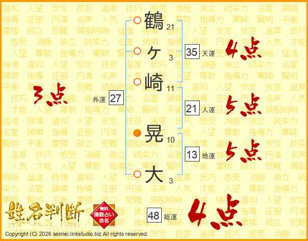 鶴ヶ崎晃大さんの総運は48画の4点!