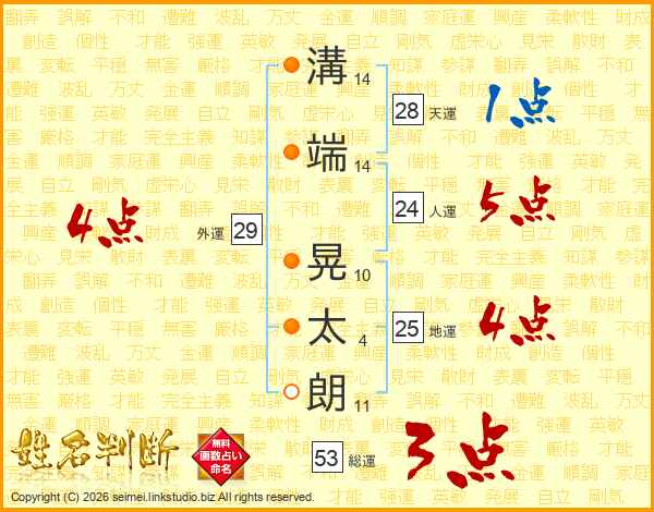 溝(14画)端(14画) 晃(10画)太(4画)朗(11画)