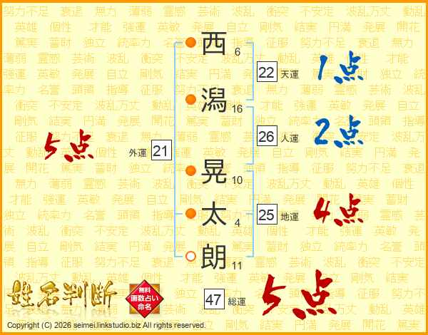 西(6画)潟(16画) 晃(10画)太(4画)朗(11画)