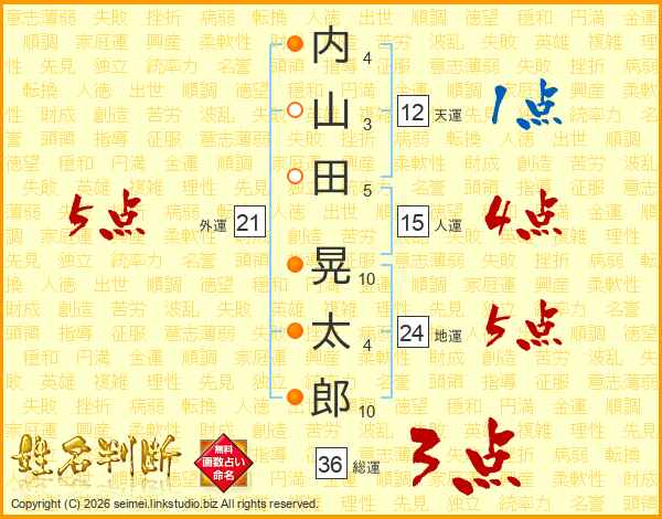 内(4画)山(3画)田(5画) 晃(10画)太(4画)郎(10画)