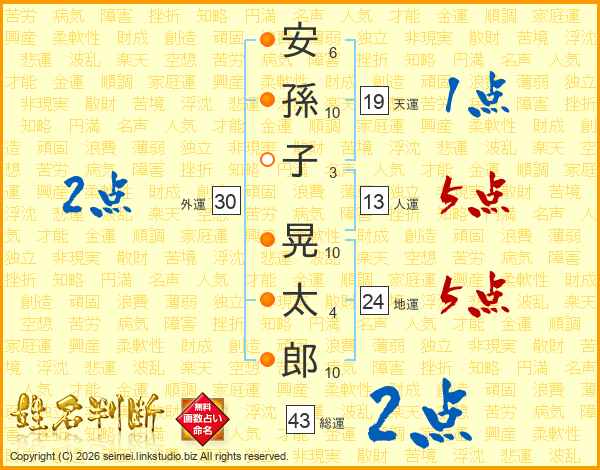 安(6画)孫(10画)子(3画) 晃(10画)太(4画)郎(10画)