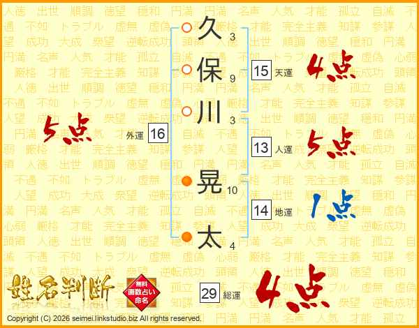 久(3画)保(9画)川(3画) 晃(10画)太(4画)