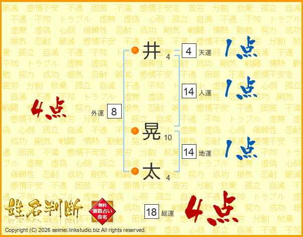 生活面を象徴する運勢です。外部から受ける影響力を表し、結婚運、家庭運や職場、環境への順応性を表します。総運から人運を引いた画数。姓や名が1文字の場合を除く。
