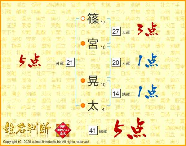 篠(17画)宮(10画) 晃(10画)太(4画)