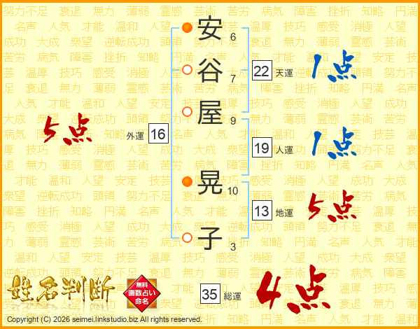 安(6画)谷(7画)屋(9画) 晃(10画)子(3画)