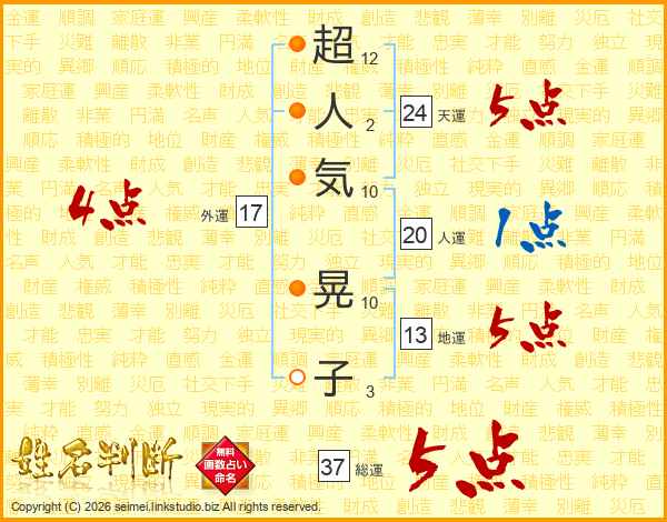 超(12画)人(2画)気(10画) 晃(10画)子(3画)