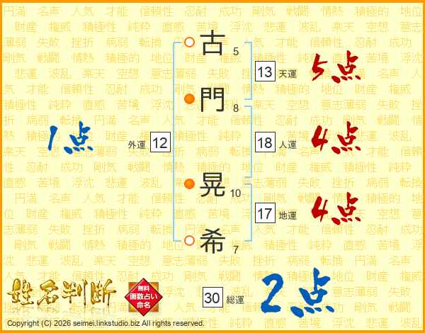 古(5画)門(8画) 晃(10画)希(7画)