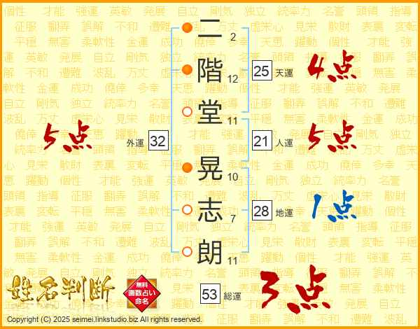 二(2画)階(12画)堂(11画) 晃(10画)志(7画)朗(11画)