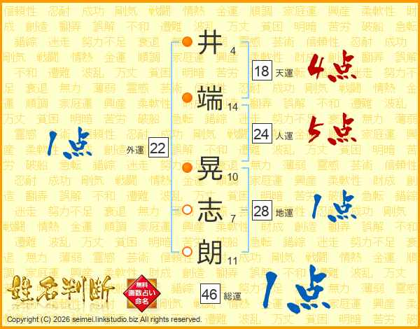 井(4画)端(14画) 晃(10画)志(7画)朗(11画)