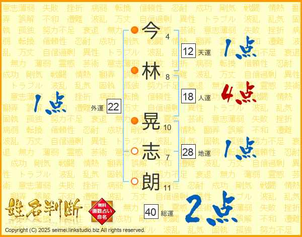 今(4画)林(8画) 晃(10画)志(7画)朗(11画)