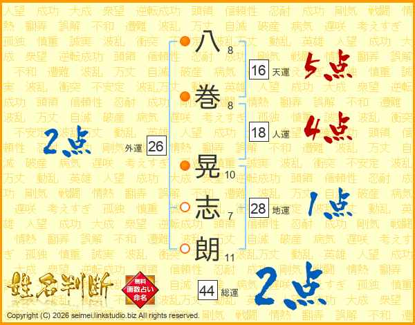 八巻晃志朗さんの総運は44画の2点!
