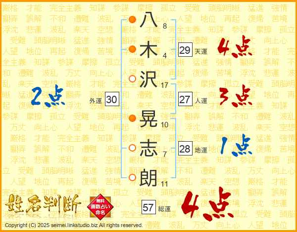 八(8画)木(4画)沢(17画) 晃(10画)志(7画)朗(11画)