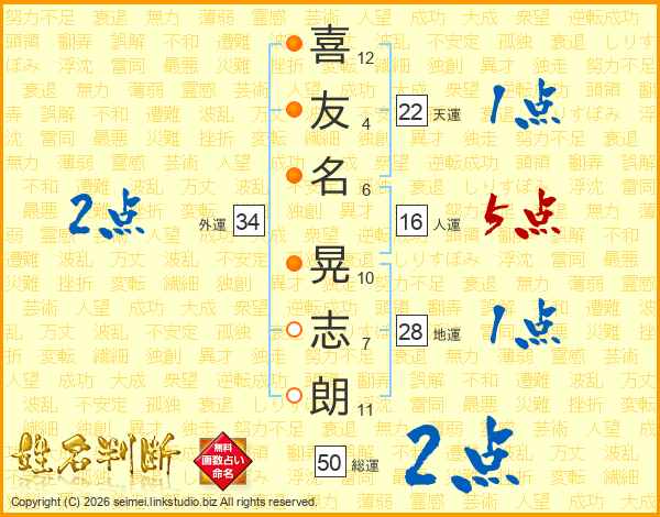 喜(12画)友(4画)名(6画) 晃(10画)志(7画)朗(11画)