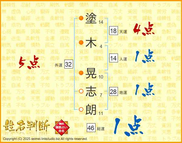 塗(14画)木(4画) 晃(10画)志(7画)朗(11画)