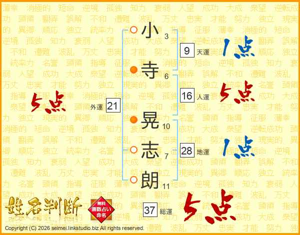 小(3画)寺(6画) 晃(10画)志(7画)朗(11画)