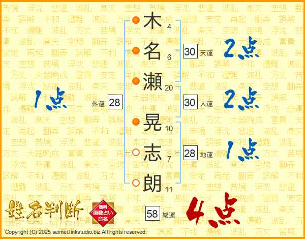 木(4画)名(6画)瀬(20画) 晃(10画)志(7画)朗(11画)