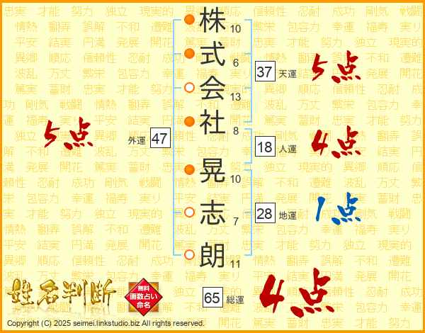 株(10画)式(6画)会(13画)社(8画) 晃(10画)志(7画)朗(11画)