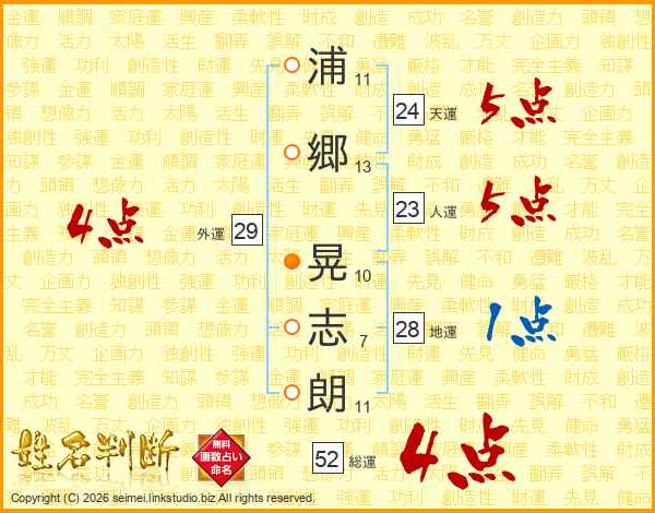 浦(11画)郷(13画) 晃(10画)志(7画)朗(11画)