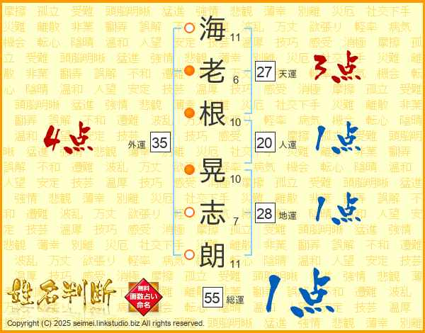 海(11画)老(6画)根(10画) 晃(10画)志(7画)朗(11画)