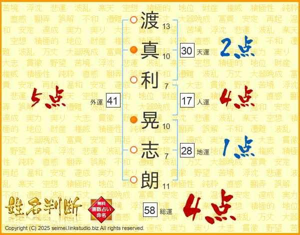 渡(13画)真(10画)利(7画) 晃(10画)志(7画)朗(11画)
